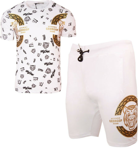 Mens Cotton T Shirt + Polyester Shorts Set LION Stripe PRINT Tracksuit Summer
